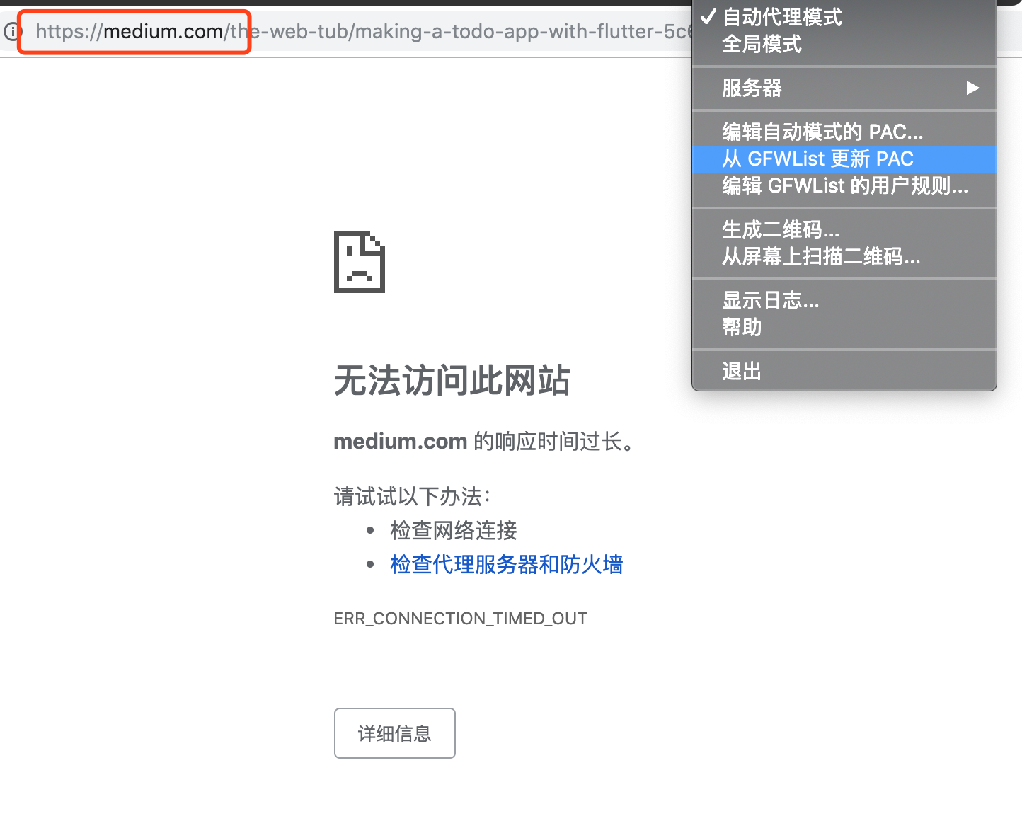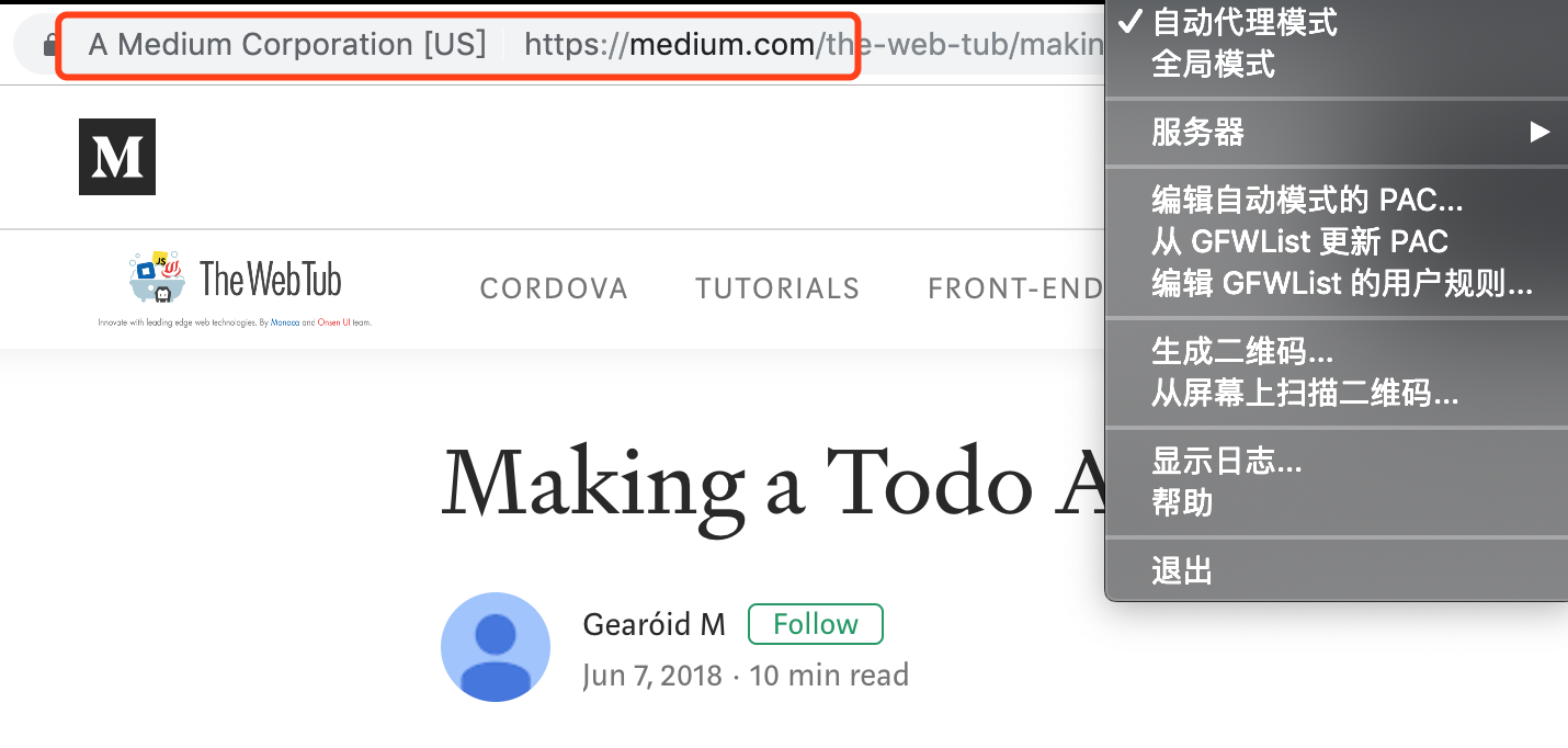 开启 Shadowsockets 的 自动代理模式 一般情况下并不能正常访问到 medium.com 的站点。