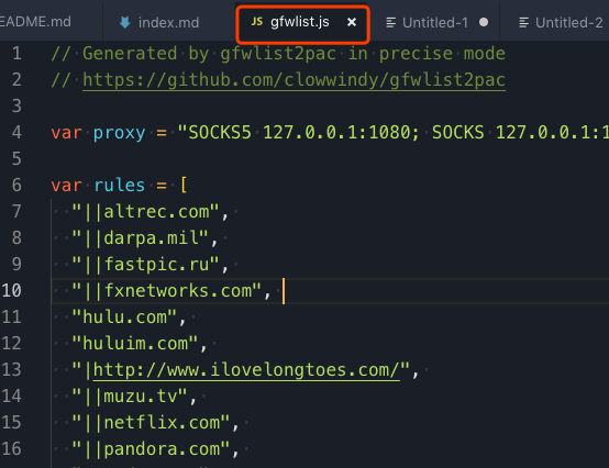 选择 编辑自动模式的PAC... 选项,会打开一个名为 gfwlist.js 的配置文件: