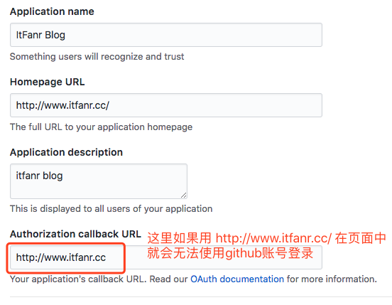 其中,Homepage URL 表示站点的网址。Authorization callback URL 为站点的回调地址,一般也默认为站点的网址。