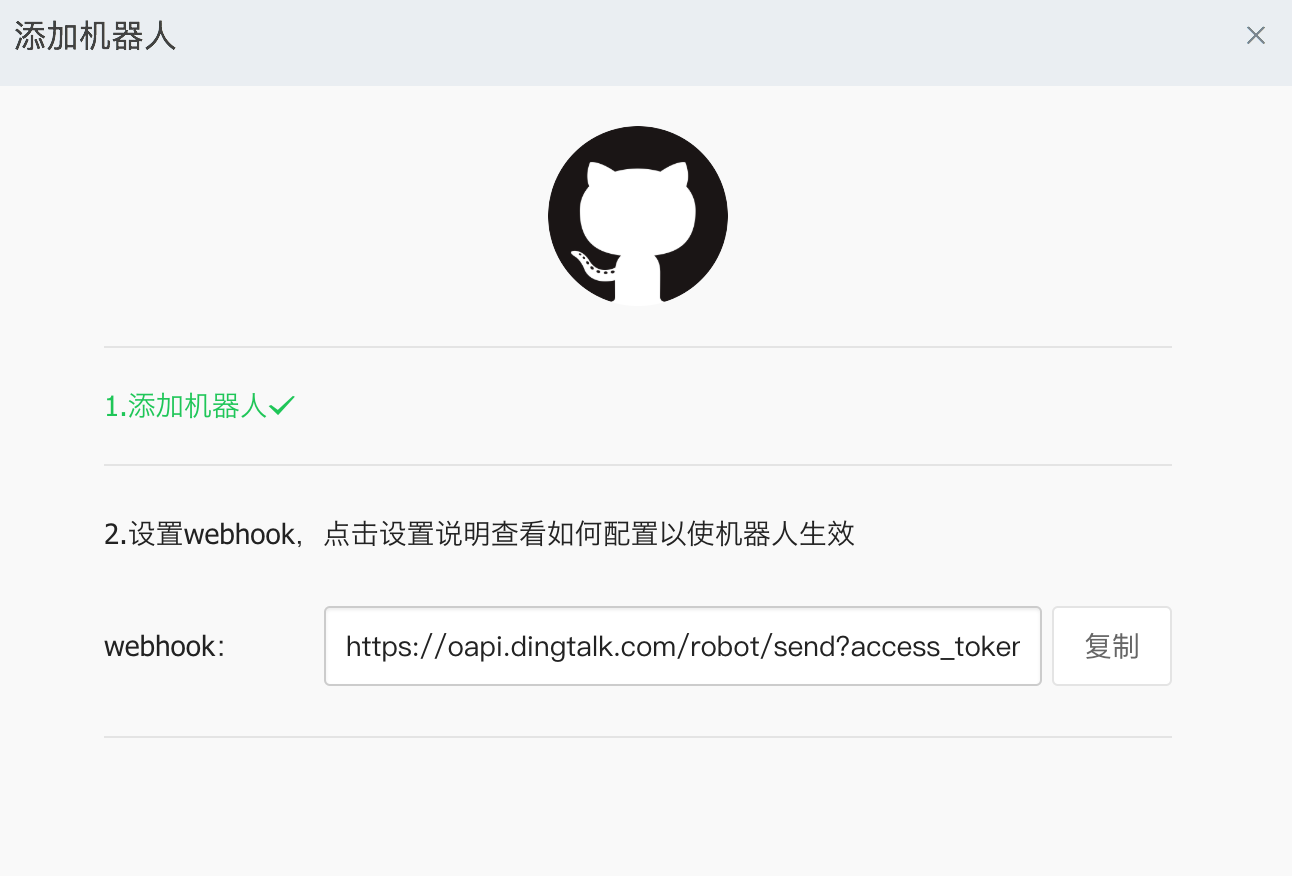 然后在 群 设置中选择 群机器人 选项,选择 GitHub机器人 ,按照设置流程生成GitHub机器人,即可获取到相应群的WebHook地址,其格式如下: