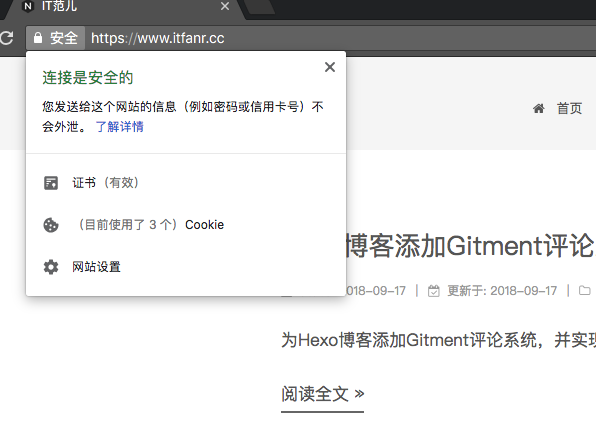 再次刷新页面后,发现如果页面中没有引用到七牛云的图片链接,地址栏中是显示“小绿锁”的,比如首页;而到了文章详情页中,引用了七牛云的图片链接后,地址栏中就会显示“叹号”的不安全标志。