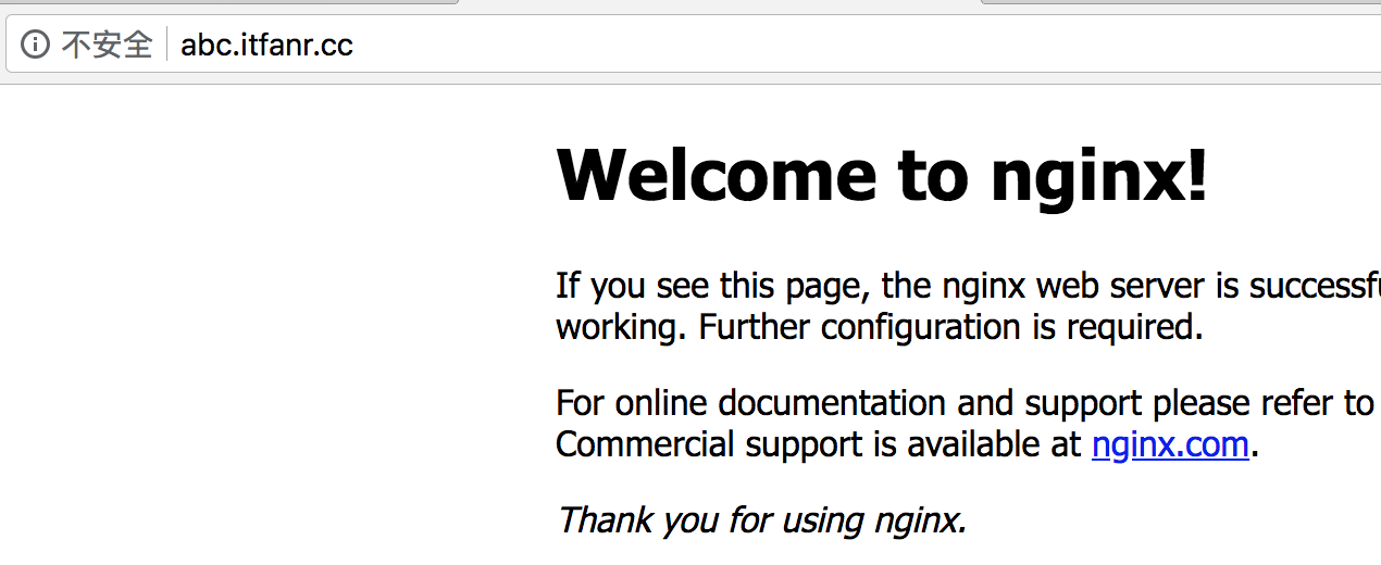 上面的设置说明,当访问域名是没有匹配到我们添加的域名,那么就会返回默认的地址。也就是这里的 Nginx默认的页面。