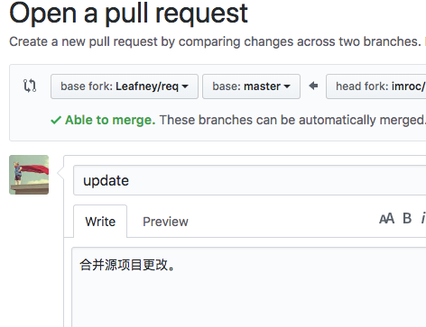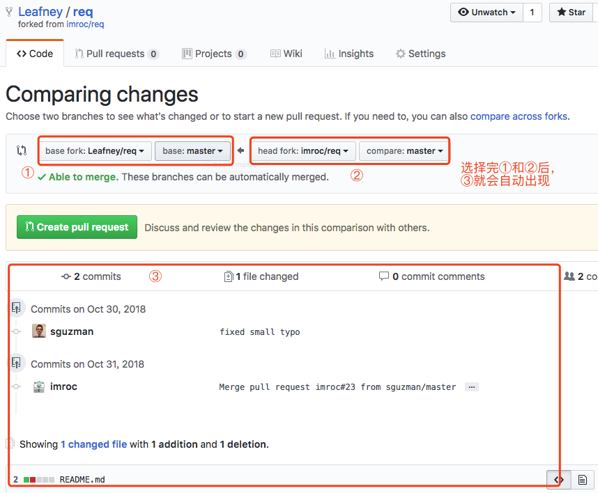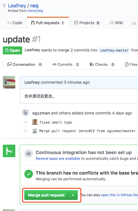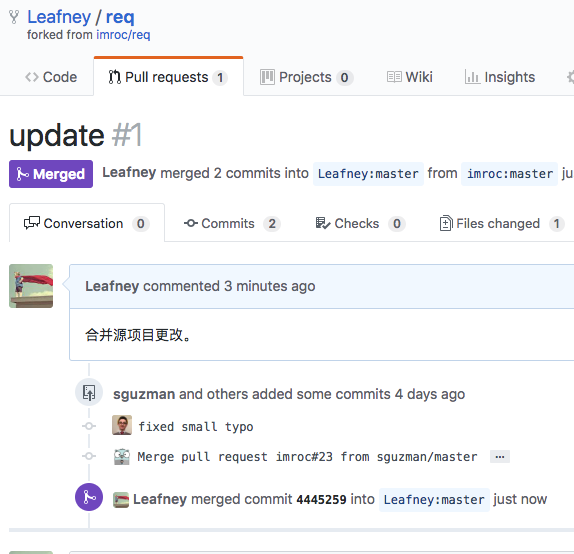 至此,就将源项目的变更在自己的项目下作了一个 Pull requests 的合并请求。点击下面的 Merge pull request ,完成合并。