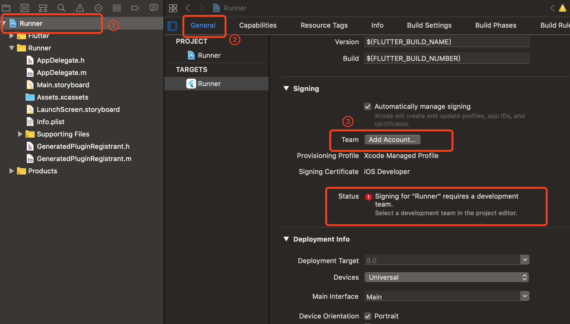 ➜ flutter run Launching lib/main.dart on xyz的iPhone in debug mode... ════════════════════════════════════════════════════════════════════════════════ No valid code signing certificates were found You can connect to your Apple Developer account by signing in with your Apple ID in Xcode and create an iOS Development Certificate as well as a Provisioning Profile for your project by: 1- Open the Flutter project's Xcode target with open ios/Runner.xcworkspace 2- Select the 'Runner' project in the navigator then the 'Runner' target in the project settings 3- In the 'General' tab, make sure a 'Development Team' is selected. You may need to: - Log in with your Apple ID in Xcode first - Ensure you have a valid unique Bundle ID - Register your device with your Apple Developer Account - Let Xcode automatically provision a profile for your app 4- Build or run your project again 5- Trust your newly created Development Certificate on your iOS device via Settings > General > Device Management > [your new certificate] > Trust