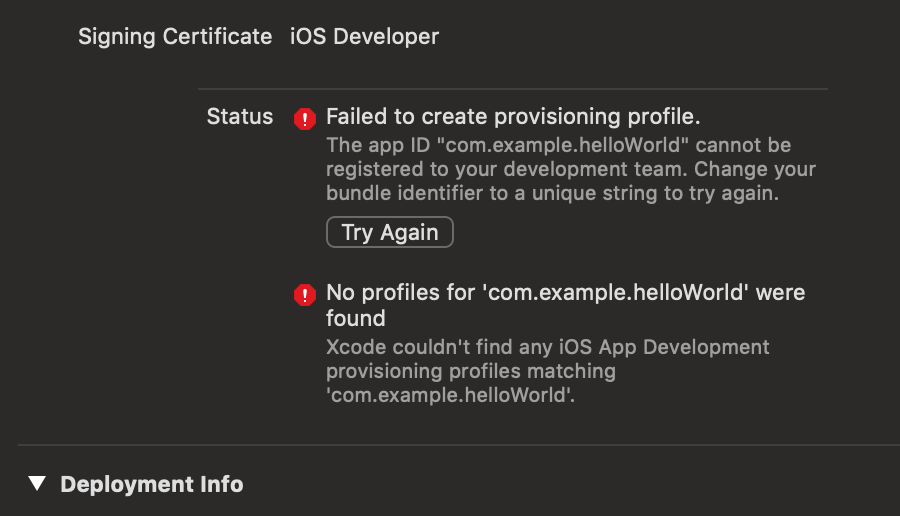 Failed to create provisioning profile. The app ID "com.example.helloWorld" cannot be registered to your development team. Change your bundle identifier to a unique string to try again.