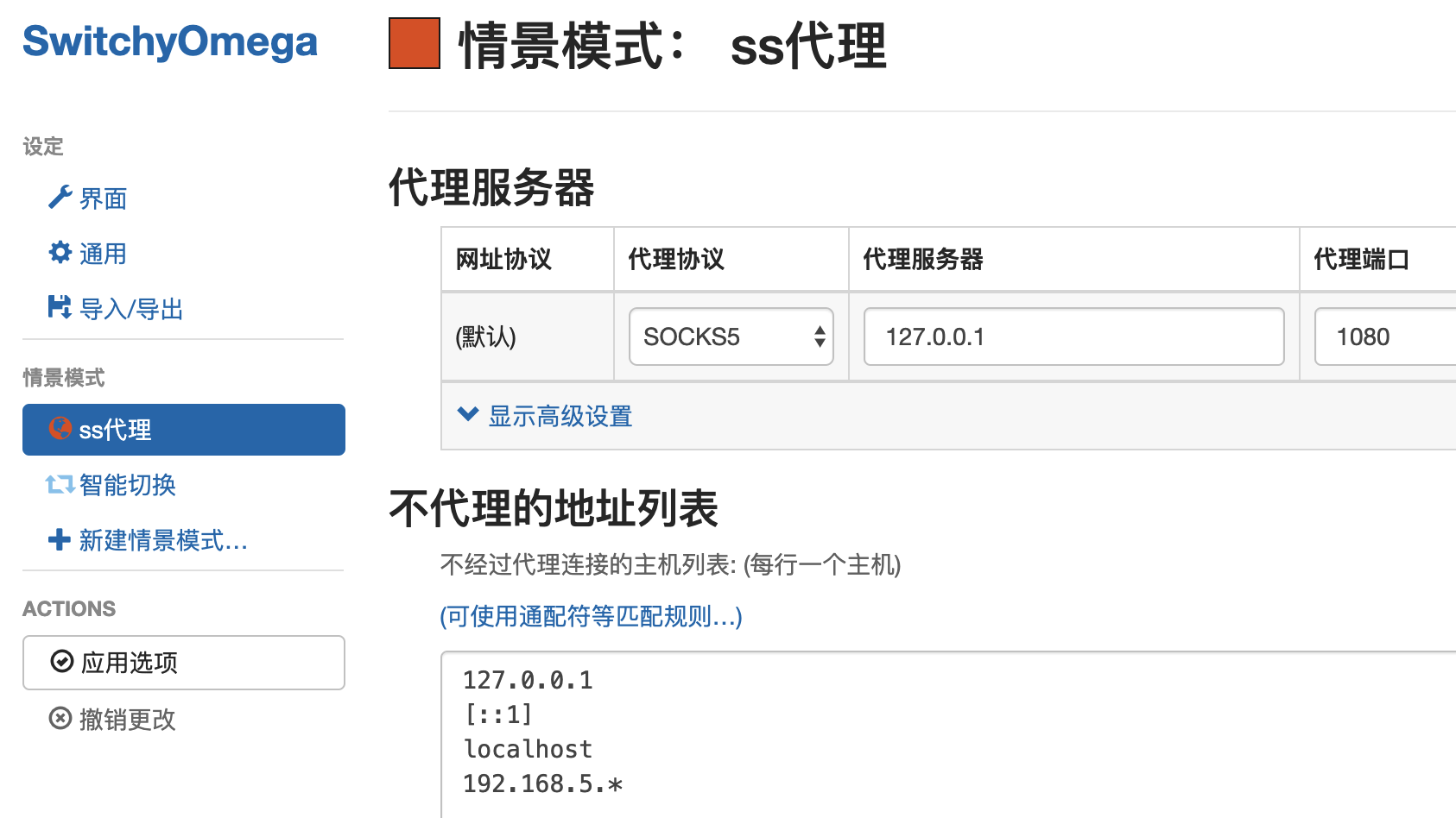 安装完成后会在 Chrome 浏览器右上角显示扩展程序的图标,选择 “选项” 打开 SwitchyOmega 选项设置界面,点击 “新建情景模式”,这里我设置名称为 ss代理(同默认的proxy模式),情景类型选择 “代理服务器”,之后新增一项 SOCKS5的代理信息: