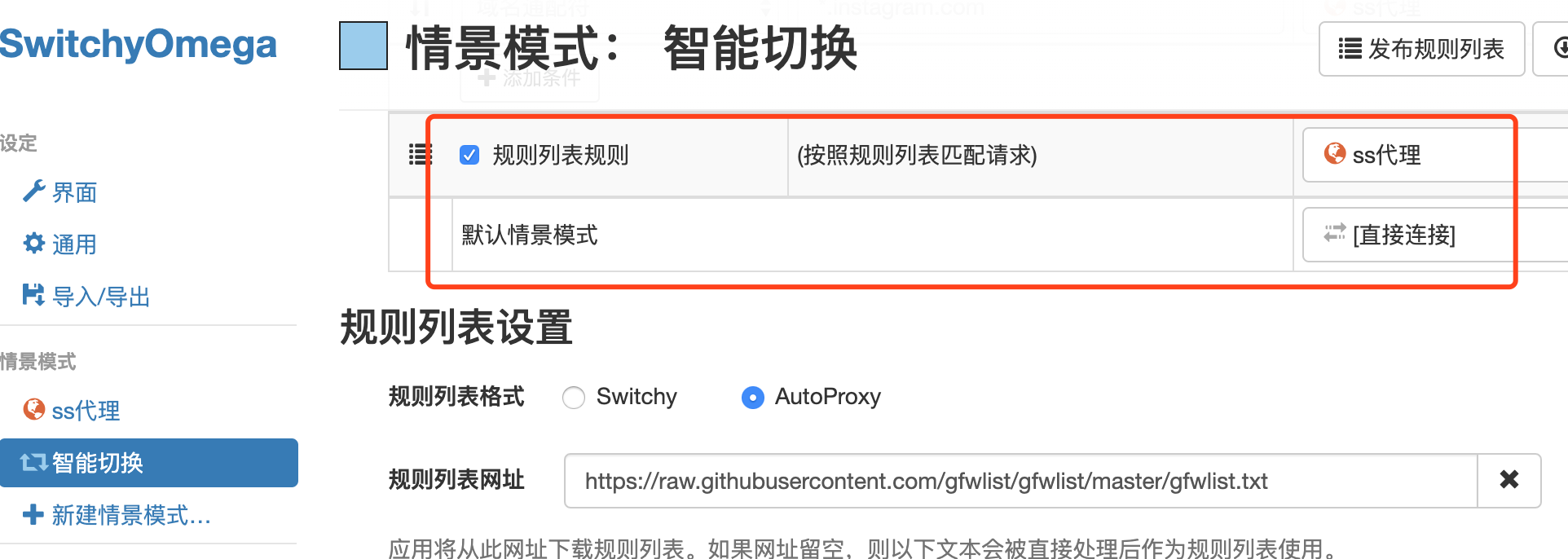 在上面的 “切换规则” 中,将 “规则列表规则” 前面的框打√,后面选择上一步设置的 “ss代理”(同默认的proxy模式) ,下面的 “默认情景模式” 选择 “直接连接” 。点击左侧 “应用选项” 保存设置即可。