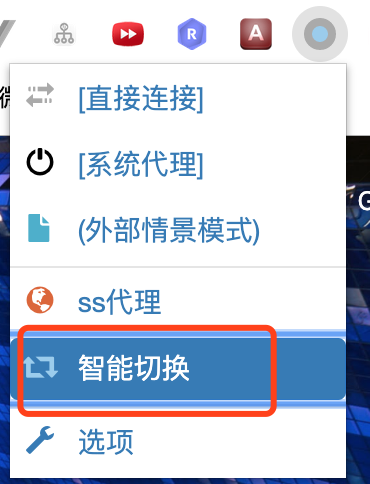 将ss的代理模式更改为 “自动代理模式”:点击 SwitchyOmega 图标选择 “智能切换” (同默认的proxy模式) 选项即可。