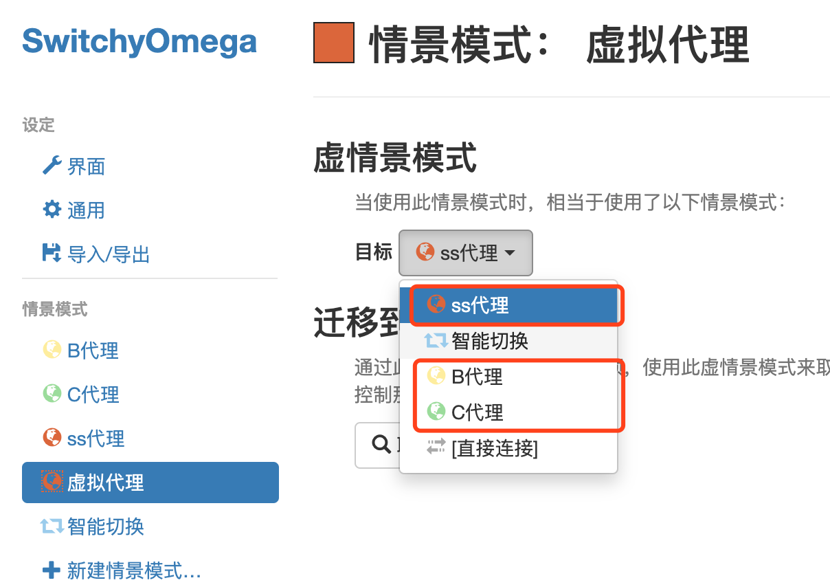 在 ”虚情景模式“ 的 ”目标“ 中,选择所有的 ”代理“ 模式其中的一项,表示默认使用的代理: