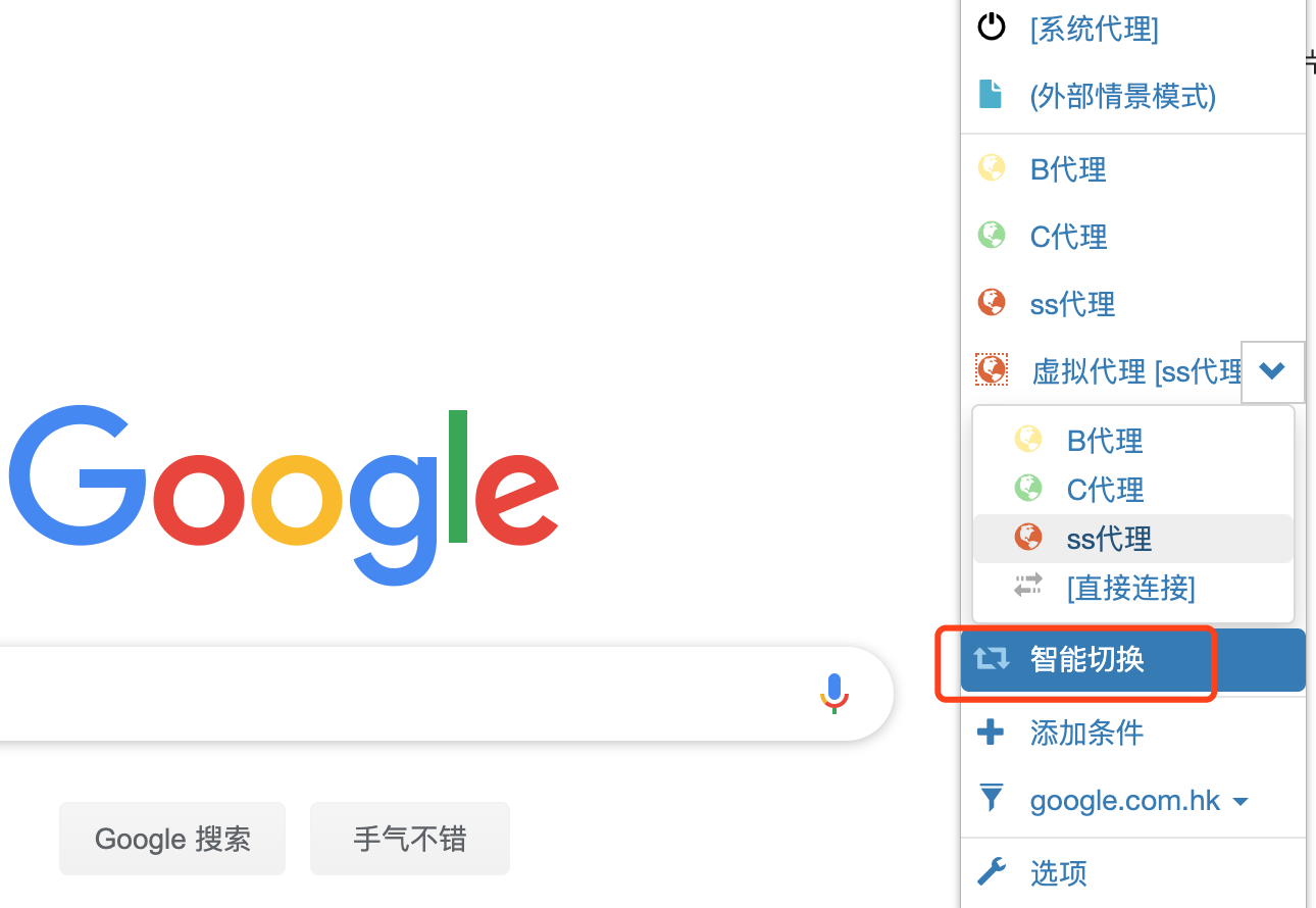 打开 google.com 页面,依旧选择 “智能切换” (同默认的auto switch模式)代理。