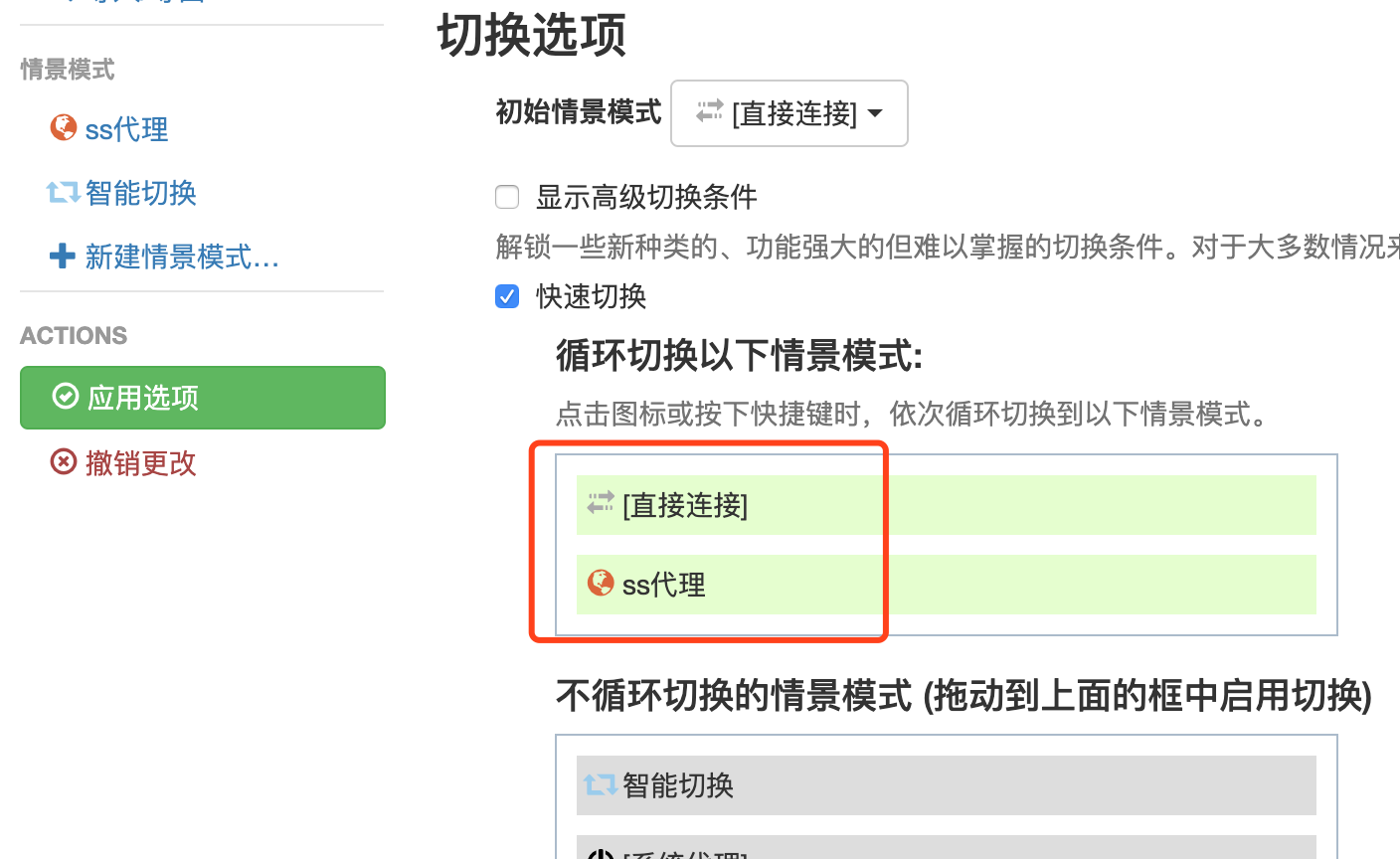 在 “循环切换以下情景模式” 中,加入 “直接连接” 和 “ss代理”(同默认的auto switch模式) 两项: